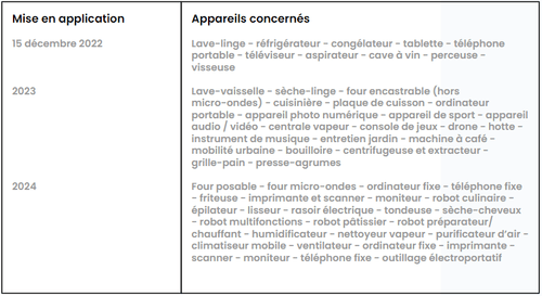 Voici le calendrier prévu pour le déploiement de l’aide à la réparation des différents appareils électriques, électroniques et électroménagers :